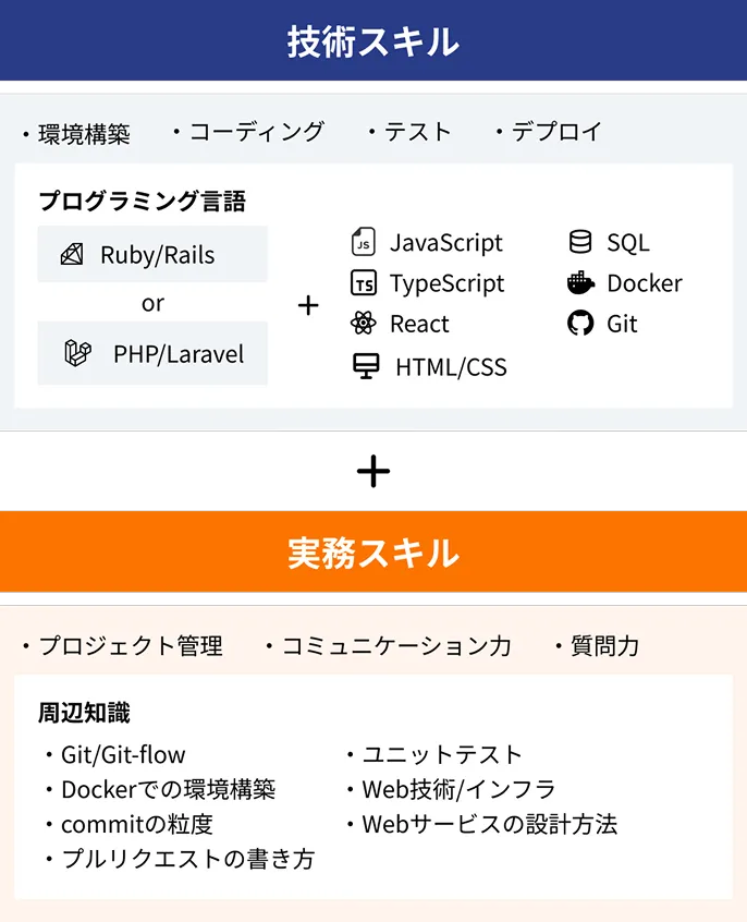 | Webを支える技術 | HTTP/HTTPSの仕組み、リクエスト・レスポンス、ステータスコード、Cookie/セッション、3層アーキテクチャ/MVC、DOM/JSON、セキュリティ(XSS/CSRF/SQLインジェクション)、認証・認可の基礎を習得できます | 15h | ○ | ○ | ○ | |
